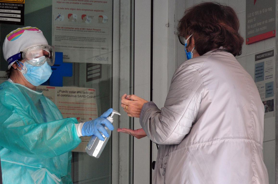 28/4/2020 Personal sanitario del CAP de Justo Oliveras en L´Hospitalet extrema las medidas de seguridad en un triaje a la puerta del centro de salud para evitar contagios por la pandemia del Covid-19