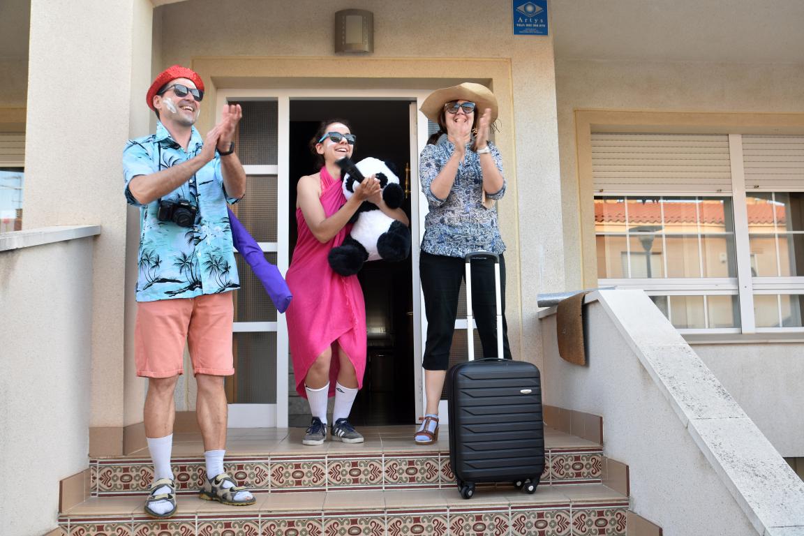 29/4/2020 Vecinos del barrio de Mas d´en Gual de El Vendrell realizan diferentes perfomances a la hora de los aplausos , hoy tocaba disfrazarse de turista extranjero